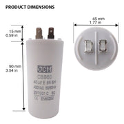 - CAPACITY: 40 uF MFD 450 VAC (works for 220V, 250V, 300V, 350V, 400V, up to 450V) AC